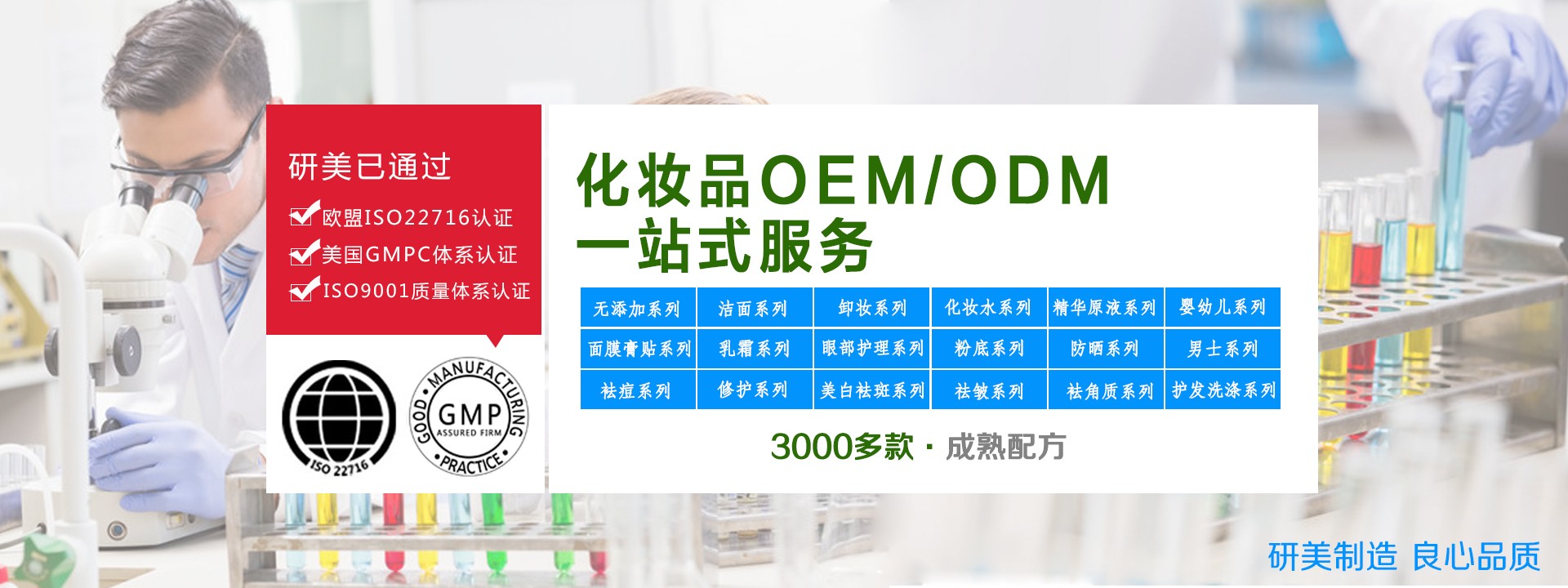 廣州市白云區(qū)研美化妝品廠由企業(yè)家陳昭武先生創(chuàng)建于2005年,是可芳化妝品集團旗下的化妝品加工廠。廠房占地面積約25000多平方米,現(xiàn)有16條化妝品生產(chǎn)線,生產(chǎn)員工300多人,研發(fā)工程師人員15人。工廠有GMP10萬級車間凈化系統(tǒng),全套乳化檢測生產(chǎn)設備,并通過了ISO9001質(zhì)量體系、歐盟ISO22716化妝品良好生產(chǎn)規(guī)范體系及美國GMPC體系認證。工廠與法國、德國、美國等歐美國家的原料供應商、設備商合作,并長期與國內(nèi)相關(guān)科研院所共同研發(fā)優(yōu)良品質(zhì)的產(chǎn)品。工廠憑借成熟的生產(chǎn)工藝、專業(yè)的服務水準,贏得了廣大客戶的認可,目前已與國內(nèi)外一百多家專業(yè)線、日化線、微商電商品牌企業(yè)建立了合作關(guān)系,是化妝品OEM/ODM加工合作的理想企業(yè)。研美一直堅持誠信經(jīng)營、精益求精的經(jīng)營理念,致力于打造口碑良好的化妝品代加工廠家平臺,為廣大品牌客戶提供專業(yè)的增值服務。